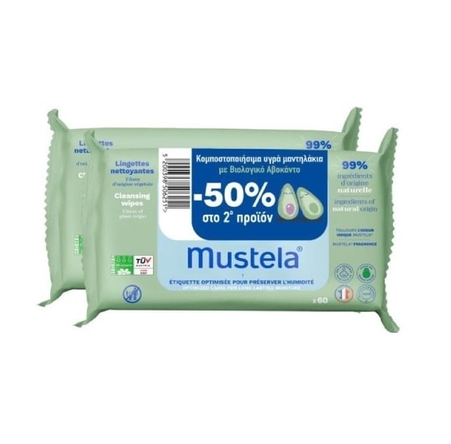 Τα Μωρομάντηλα Καθαρισμού Mustela® με βιολογικό αβοκάντο και κομποστοποιήσιμες, -απαλλαγμένα από πλαστικό- φυτικές ίνες, καθαρίζουν απαλά και αποτελεσματικά το δέρμα του μωρούπρόσωπο, χέρια και μηρογεννητική περιοχή, αφήνοντάς το απαλό και ενυδατωμένο.Με 97% συστατικά φυσικής προέλευσης, τα απαλά μαντηλάκια είναι κατάλληλα γιαχρήση από την πρώτη ημέρα της γέννησης*. Ανθεκτικά αλλά και απαλά στο άγγιγμα.
